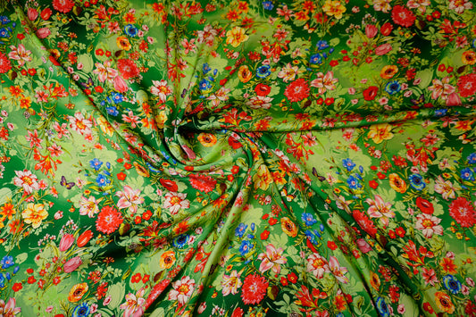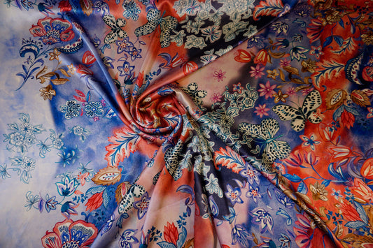 Seidensatin mit kunstvollem Blumen- & Schmetterlingsdesign