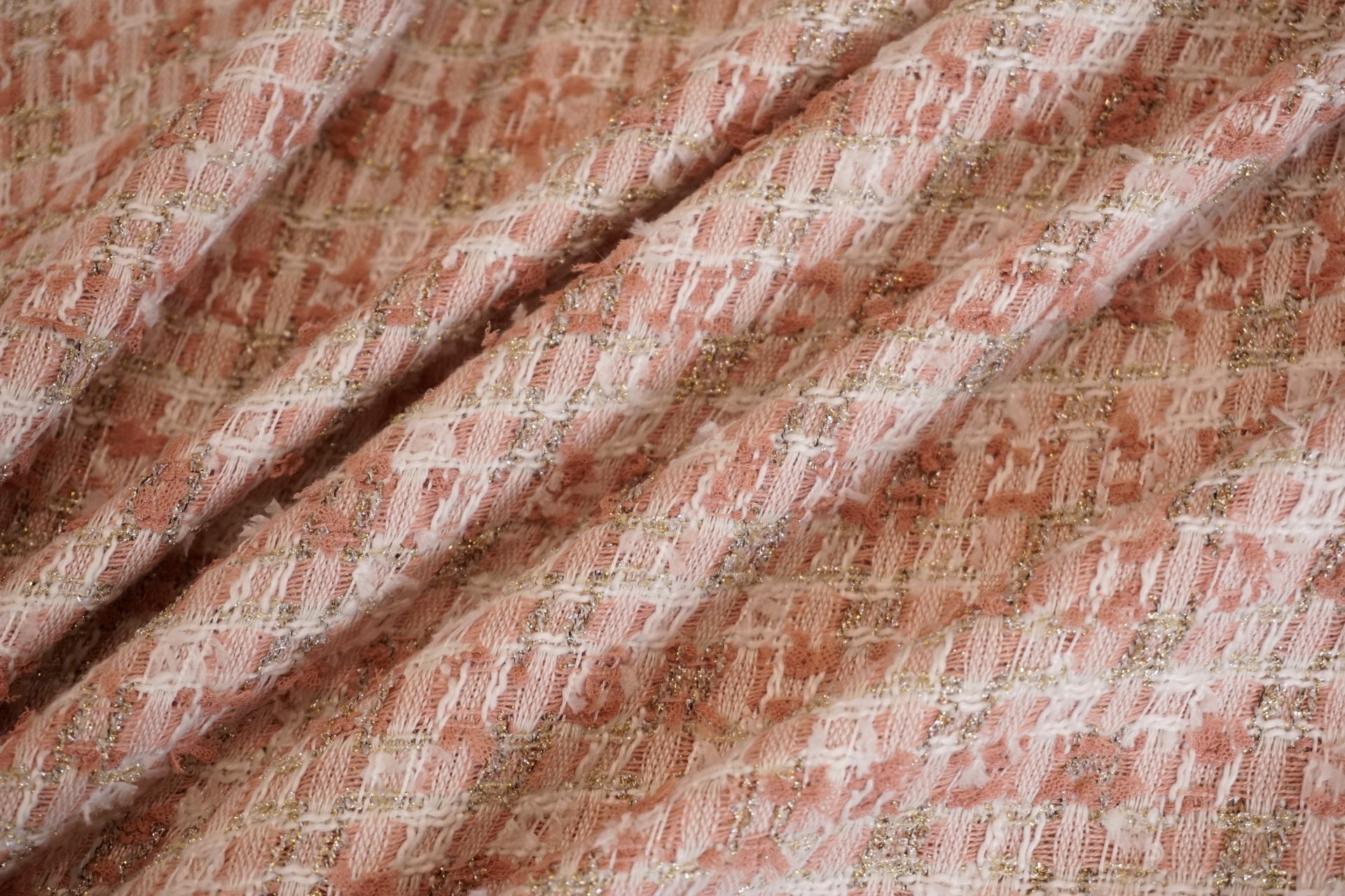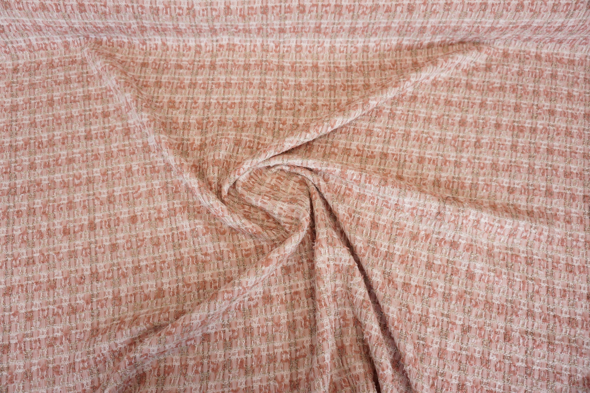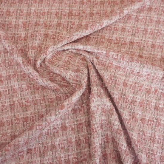 Dieser hochwertige Bouclé-Stoff begeistert mit einer edlen Farbkomposition aus sanftem Rosé und Creme, die dem Gewebe eine feminine und zugleich moderne Ausstrahlung verleiht. Die fein strukturierte Oberfläche mit charakteristischer Bouclé-Optik sorgt für Tiefe, Lebendigkeit und einen stilvollen Tweed-ähnlichen Effekt – inspiriert von klassischer Haute Couture.