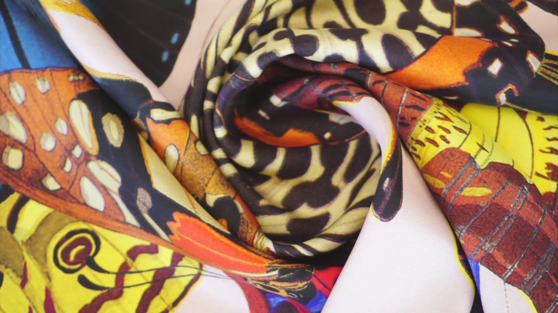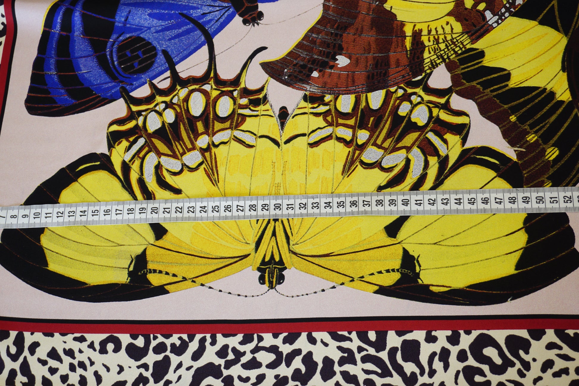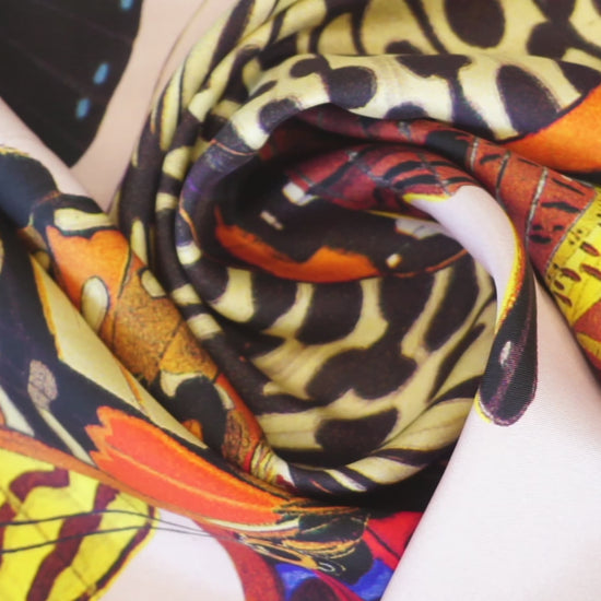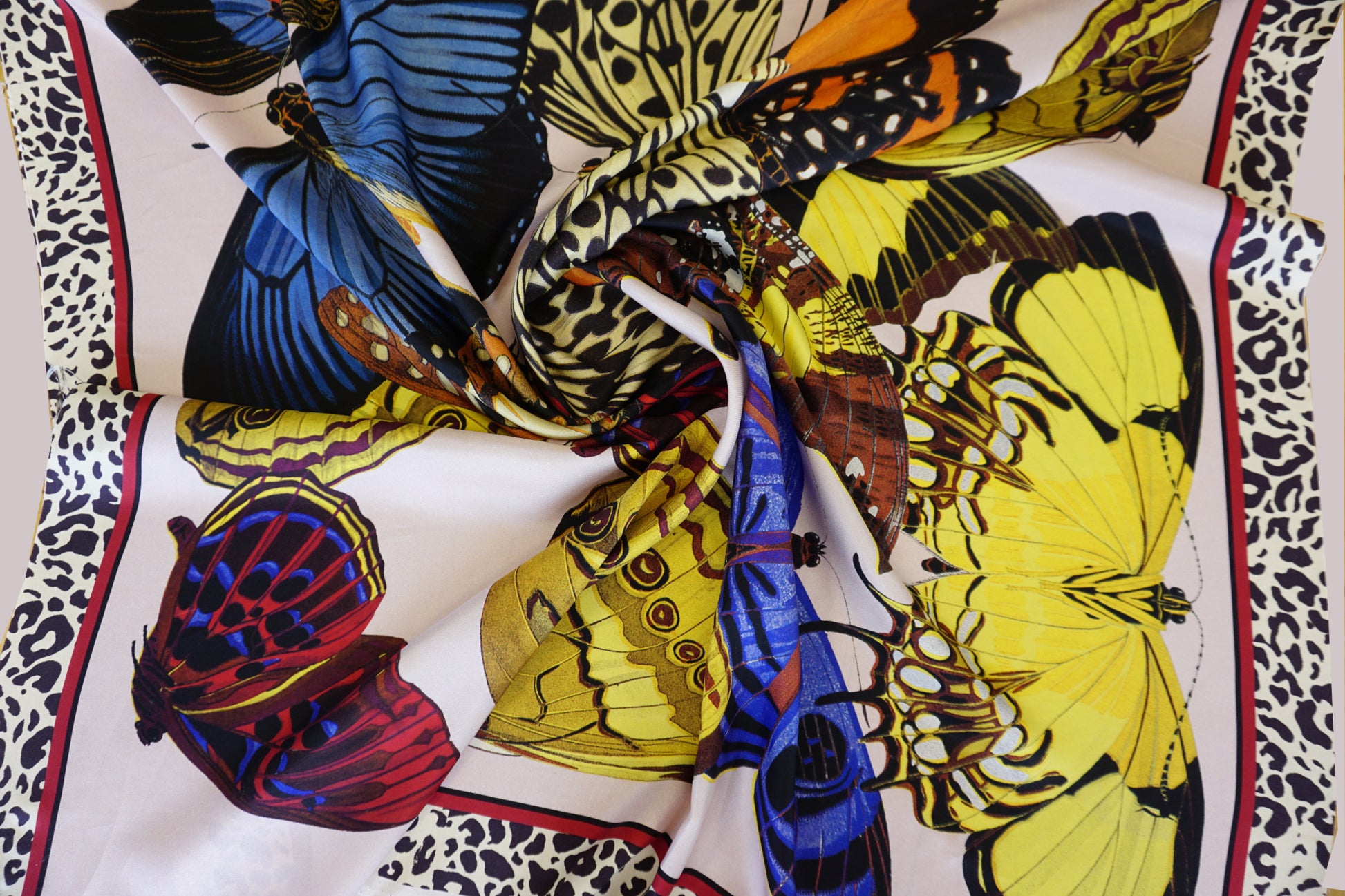 Highlights: ✔ Material: 100% Seide ✔ Breite: 100 cm x 99 cm Länge ✔Design: Große Schmetterlinge auf Hellrosa mit Leo-Print-Bordüre ✔ Haptik: Seidig glatt, kühlend und federleicht