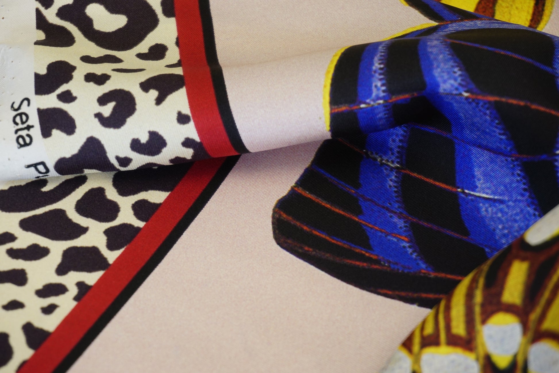 Erleben Sie italienische Handwerkskunst in ihrer schönsten Form. Dieses großformatige Tuch aus 100% reinster Seide ist ein modisches Statement für Liebhaberinnen extravaganter Designs. Das Zentrum des Tuchs besticht durch ein romantisches, hellrosa Fond, auf dem große, detailreiche Schmetterlinge in lebendigen Farben thronen. Den spektakulären Rahmen bildet ein kontrastreicher Leo-Print-Rand, der dem femininen Design eine wilde, moderne Note verleiht.